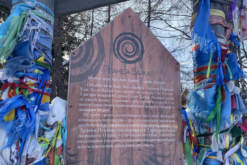 По пути мы остановились у стелы при въезде в Ольхонский район, чтобы «побурханить» (задобрить местных духов). Побрызгали молоком и оставили монетку. Очень грустно было увидеть много завязанных ленточек на деревьях — это причиняет вред деревьям! Если вы хотите завязать ленточку, то делайте это не на дереве, а на специальной стойке, которая предназначена для этого.