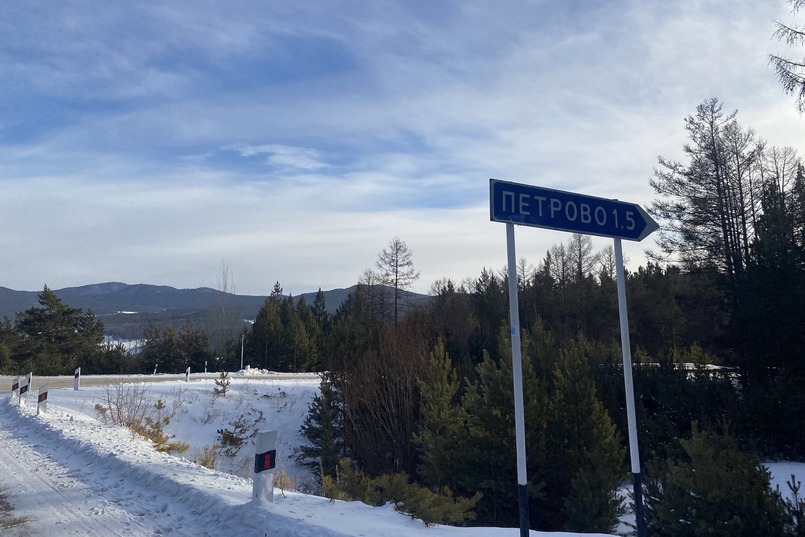 В поселок Бугульдейка ведут две дороги, мы свернули на ту, где была вывеска Петрово — дорога лучше. Практически сразу же начинается гравийка. Мы комфортно ехали со скоростью 80 километров в час и никакой тряски не чувствовали. Дорога практически прямая с небольшими подъёмами и спусками. Местами густой хвойный лес красиво сдвигается прямо к обочине. Примерно через 25 минут, на 38 километре, будет отворот направо, чуть в горку – туда-то нам и нужно. Машина резво забралась в горку по заснеженной дороге. Оставили автомобиль у знаков и дальше пошли пешком.