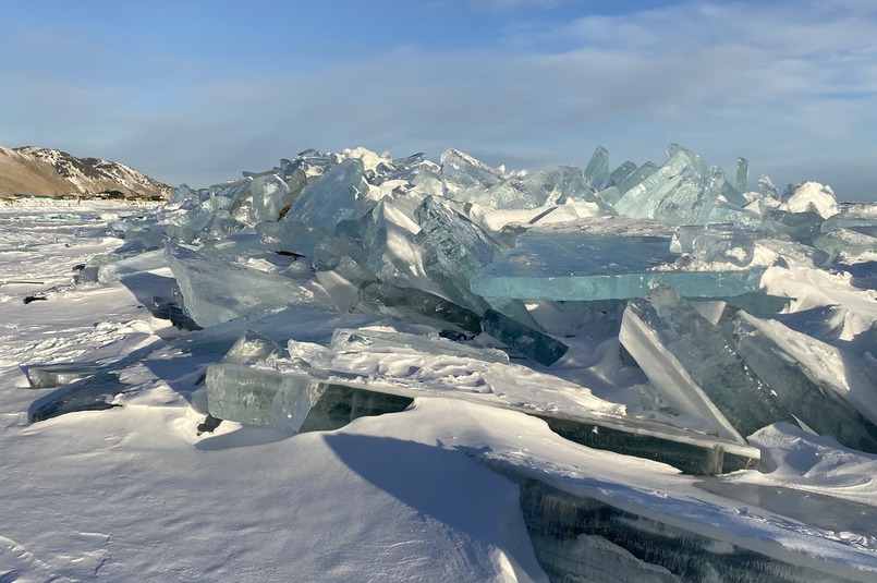 Вдруг издалека мы увидели на берегу голубой «айсберг». Не раздумывая, свернули с дороги к Байкалу. Это был огромный торос, выше человеческого роста – выглядело очень впечатляюще!