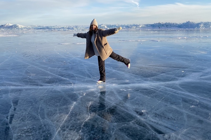 Возвращаемся к автомобилю и продолжаем путь к Байкалу. Проезжаем через посёлок, перед магазином «Багульник» поворачиваем направо и затем проезжаем по деревянному мостику. По-другому Бугульдейку называют «королевой ветров», поэтому здесь практически всегда тот самый чистый лёд. Мы переобулись в коньки и отправились кататься
