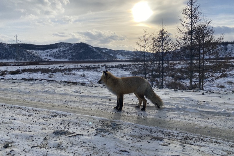 Спустя 5 минут езды на дорогу вышла пушистая лисичка. Кстати, кормить диких животных «человеческой» пищей нежелательно, поэтому мы просто сфотографировали её и поехали дальше.